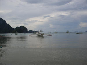 By Boat from Port Barton or Sabang - My favorite way to get to El Nido is by boat (bangka) from Sabang or Port Barton. The coastline leading up to El Nido is beautiful. The limestone islands rise out of the water all around. I have seen sea turtles come up for air and often see schools of flying fish. As the bangka rounds the last limestone headland - there is El Nido. The setting is fantastic – rugged limestone outcrops crowned with dense jungle foliage form the backdrop, the beach gently curving around the bay provides the foreground.