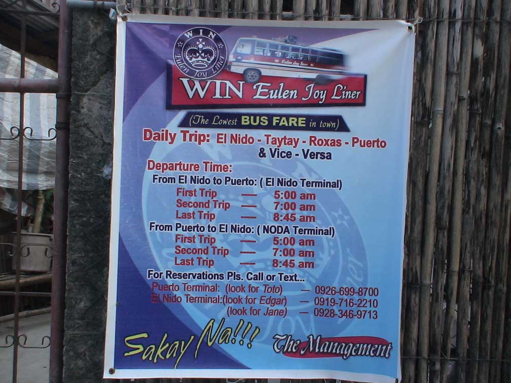 To and From Puerto Princesa by Bus or Van - By bus costs P350 and by van is P500. The bus will take about 8 hours while a van will take about seven hours. The van is air-conditioned and the bus is not. You will be squashed in like a sardine in the van and also in the bus, but the bus will feel less claustrophobic. The windows of the bus will be open and you may eat a lot of dust if the road is dry. All vehicles traveling to El Nido from Puerto Princesa will leave from the San Jose bus terminal, about 7km from the airport. Vans and buses leave about the same time. The Eulen Joy Liner bus leaves both Puerto and El Nido at 5am, 7am and 8:54am daily. For more information and contact details, I have a taken a picture of their poster which can be seen by clicking here.